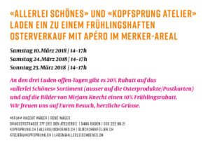 An diesen drei Tagen gibt es 20% Rabatt auf das «allerlei Schönes» Sortiment (ausser auf die Osterprodukte/Postkarten) und auf die Bilder von mir