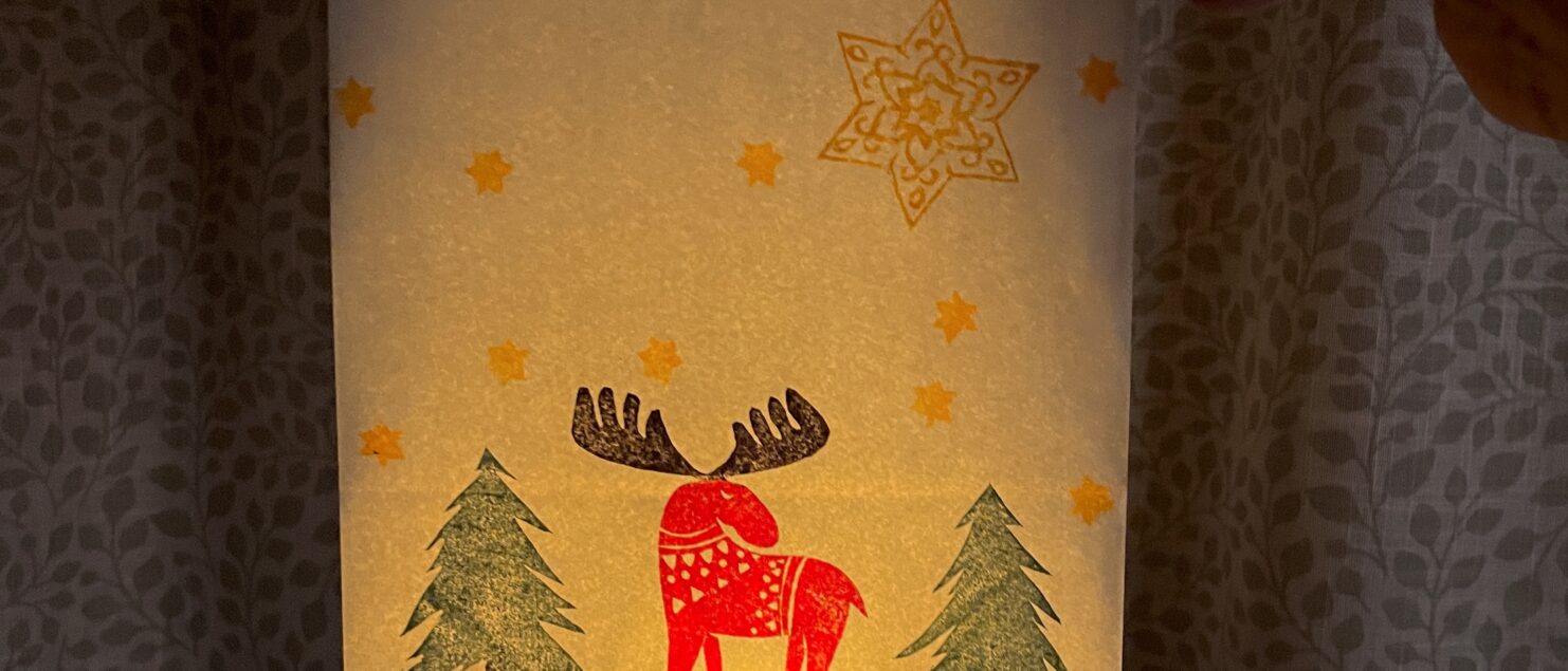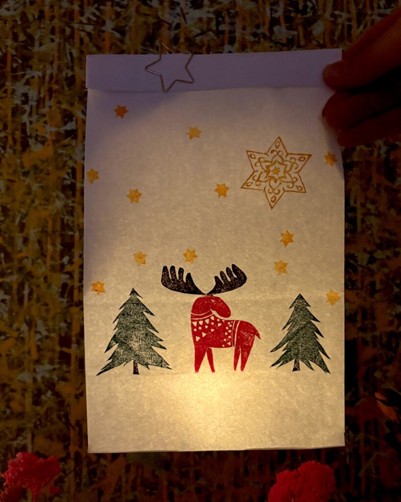 Ihr könnt bei mir kreativ sein und gratis eure eigene Lichttüte gestalten: Mit meinen handgeschnitzten Stempeln, Papiersack, Stempelfarben und LED-Licht kreiert ihr euer persönliches Advents-Windlicht. Es hat sechs Arbeitsplätze am Tisch, eine Lichttüte pro Person, nur solange der Vorrat reicht.